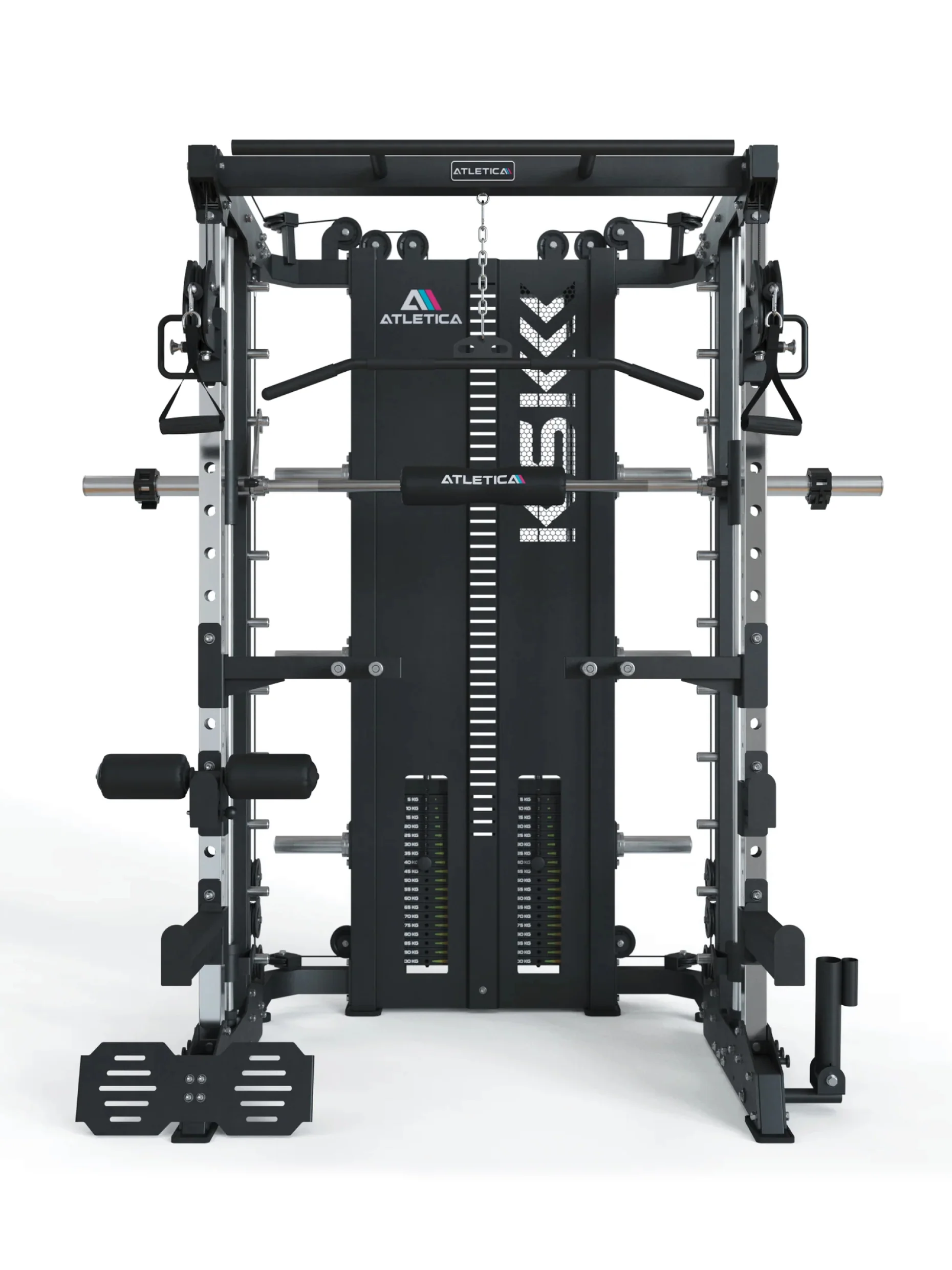 - Die leichtgängige Smith Machine mit Lock-Sicherung garantiert sichere Ausführung schwerster Grundübungen in perfekter Technik.