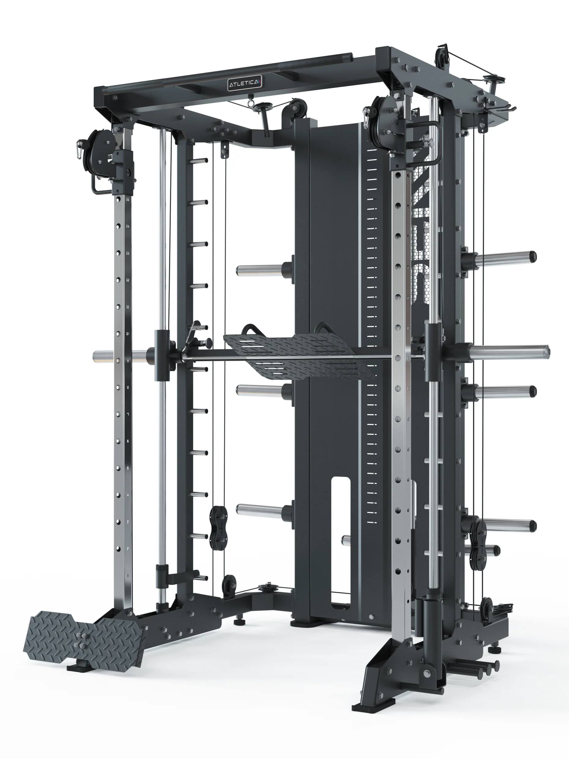 - Zubehör: 6 Gewichts-Pin, 2 Hantelstangen-Halter, Safety Spotter Arme, Landmine-Trainer mit T-Bar-Griff, Dip-Barren, Leg-Blocker, Fußplatte, Latzugstange und duale Zugstange, Einzelgriffe, Curl-Stange und Trizeps-Seil, Collars